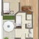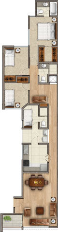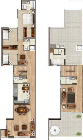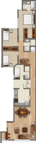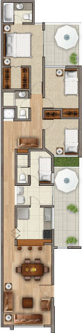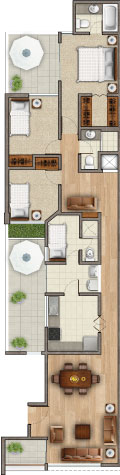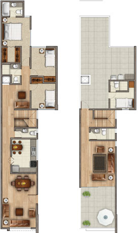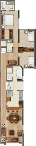 Los estacionamientos están ubicados en el semi sótano del edificio logrando el máximo de aprovechamiento del área para los departamentos en seis modelos distintos: cuarto y baño de servicio, 3 dormitorios, 2 o 3 baños completos, patio lavandería, azotea tendal.